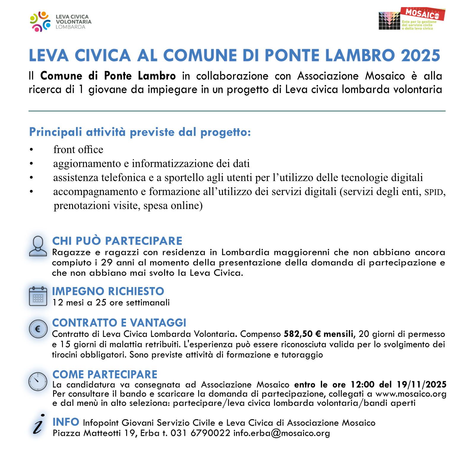 Il Comune di Ponte Lambro, in collaborazione con l'Associazione Mosaico, è alla ricerca di 1 giovane, che non abbia ancora compiuto i 29 anni al momento della presentazione della domanda di partecipazione, da impiegare in un progetto di Leva Civica Lombarda volontaria.