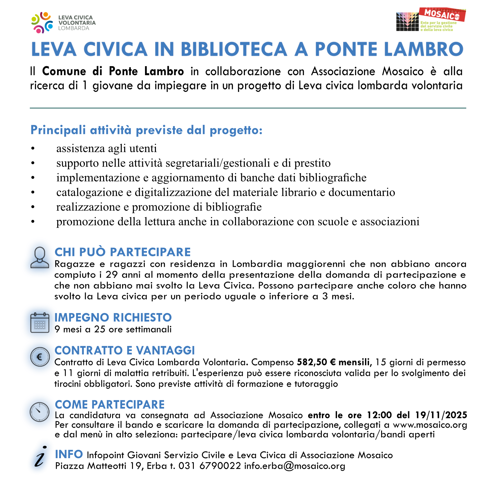 Il Comune di Ponte Lambro, in collaborazione con l'Associazione Mosaico, è alla ricerca di 1 giovane, che non abbia ancora compiuto i 29 anni al momento della presentazione della domanda di partecipazione, da impiegare in un progetto di Leva Civica Lombarda volontaria.