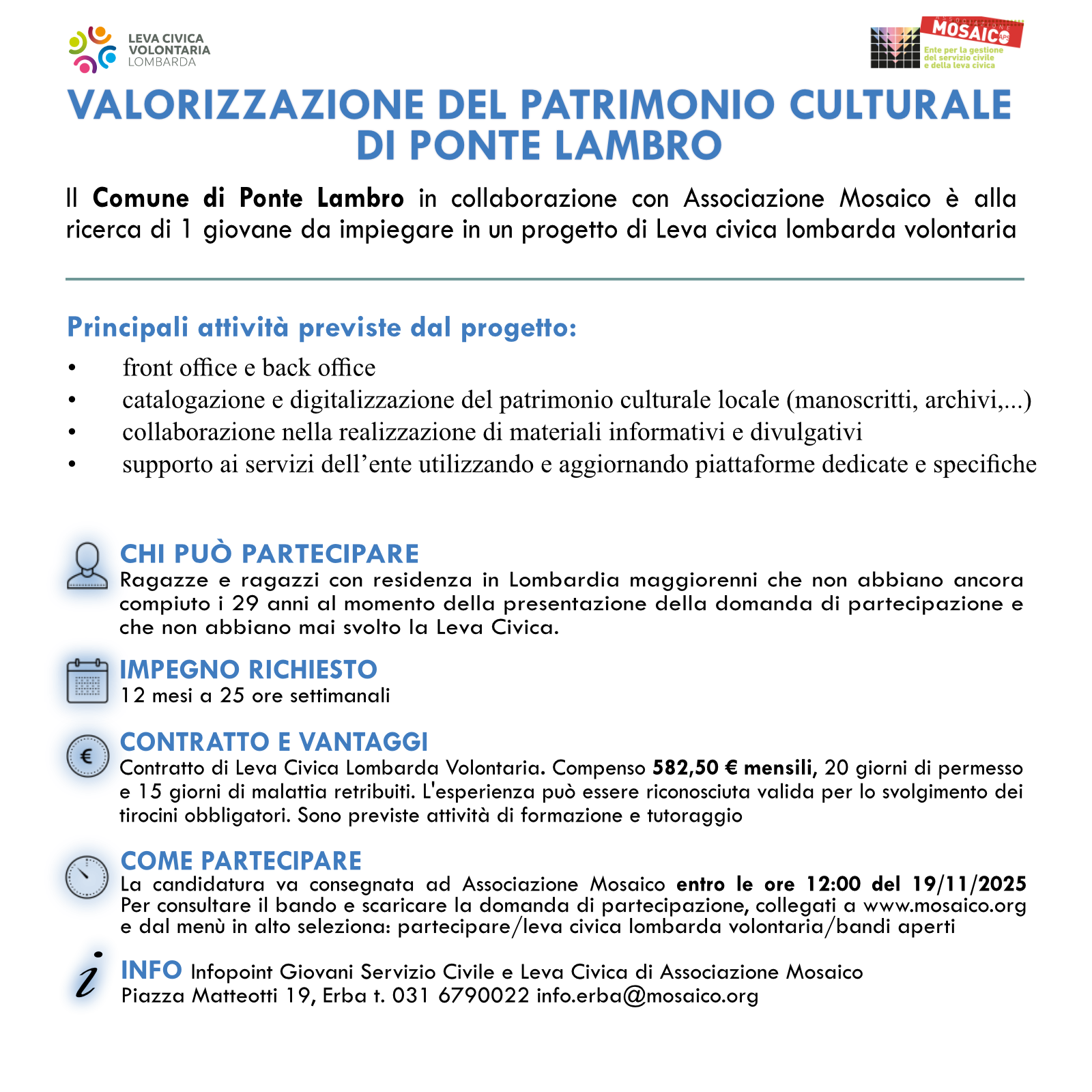 Il Comune di Ponte Lambro, in collaborazione con l'Associazione Mosaico, è alla ricerca di 1 giovane, che non abbia ancora compiuto i 29 anni al momento della presentazione della domanda di partecipazione, da impiegare in un progetto di Leva Civica Lombarda volontaria.